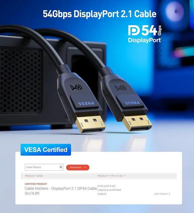 VESA Certified: Display Port cable 2.1 features VESA certification; VESA Certified DisplayPort cable 2.1 is certified for DP54 standard; UHBR 13.5 transmission mode offers 54Gbps of data transfer; Backward compatible with DisplayPort 2.0 1.4 and 1.2. All Latest DP 2.1