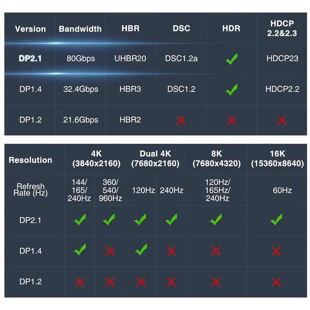 Engineered for high-end gamers this 16K DisplayPort cable integrates key technologies like VRR FEC ALLM and DSC 1.2 a to ensure stable data transfer and a supremely smooth fluid visual experiencefree from lag screen tearing and flickering. MST support enables expansive multi-monitor setups while Dynamic HDR brings out critical details in dark scenes. With support for 32-bit audio and lossless surround sound it provides a competitive edge by helping you pinpoint enemy movements in FPS and other AAA titles. The FURUI 6FT DisplayPort 2.1 Cable is a VESA-certified DP80 solution offering an 80Gbps bandwidth. It delivers uncompressed video at 4K@240Hz 8K@60Hz and 2K@540Hz and with DSC enabled supports resolutions up to 16K@60Hz 8K@240Hz and 4K@960Hz.