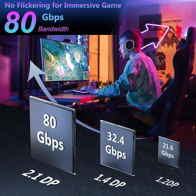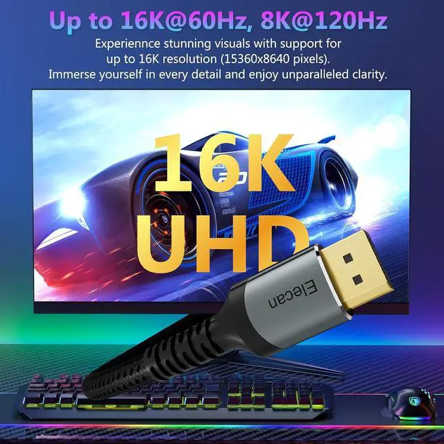 (Important: Exclusively for DP to DP connections Not HDMI or Mini DP)Optimal Choice for Gaming EnthusiastsThe 16K display port 2.1 cable features an unprecedented bandwidth of 80Gbps nearly 3 times faster than the prior DP 1.4 spec. This ensures stable high-speed data transmission without signal loss. It supports gaming essentials such as FreeSync and G-Sync. Immerse yourself in thrilling multi-screen gaming with MTS while Variable Refresh Rate (VRR) and Auto Low Latency Mode (ALLM) make your gaming smoother than ever especially in FPS 3A and MOBA gamesLifelike VisualsElecan displayport to displayport cable 2.1 goes beyond the ordinary supporting 3D HDR10 HBR20 HDCP 2.2 DSC 1.2 a and FEC for an unmatched immersive experience. HDR in particular elevates your viewing with its breathtakingly rich colors and sharp contrasts. Don't miss a sound with 32-bit audio and Dolby&eARC capturing even the faintest enemy footsteps and breathing. Thoughtful Anti-Interference DesignElecan 16K display port cables is made of 28AWG tinned copper which features triple shielding to ensure stable signal transmission; double Nylon Braided and 24K Gold Plated connectors ensuring stable heat dissipation to extending product life. Wide CompatibilityElecan 16K@60Hz DisplayPort to DisplayPort cable is compatible with all devices with DP ports compatible with Nvidia RTX 3070/RTX 3080/RTX 3090/RTX 4090/RTX 4080ti/RTX 4070ti graphics cards and AMD Radeon RX 6800 XT/RX 6900 XT/RX 7900 XT graphics cards and Odyssey G8/G9 Ben Q Alienware LG Ultragear monitors HDTV Fire TV computer and others.