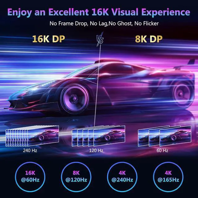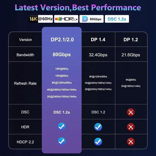 Not HDMI or Mini DisplayportForefront 16K DisplayPort CableElecan 16K DP to DP 2.1 cable supports 16K@60Hz (15 360×8 460) with DSC 10K@60Hz 8K@120Hz/60Hz 4K@240Hz/165Hz/144Hz 2K@240Hz/165Hz/120Hz. This is the only Display Port cable you'll need for the next decade. It's also backward compatible with DisplayPort 2.0 1.4 1.3 and 1.2.