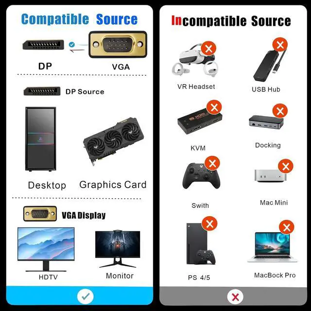 NOT USB TO VGA or USB TO HDMIQuality AssuranceWe provide a 12 month worry free warranty and friendly customer service for the DisplayPort to VGA Cable. If you have any questions about this product please feel free to contact us through messaging. We will solve your problem within 24 hours.
