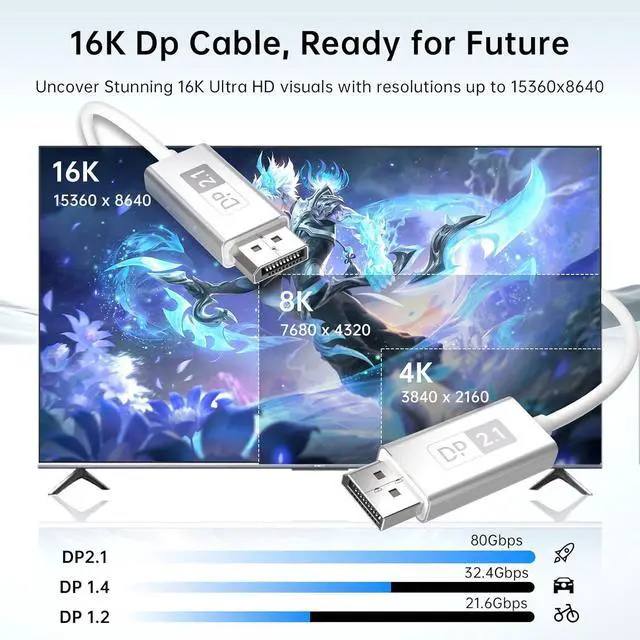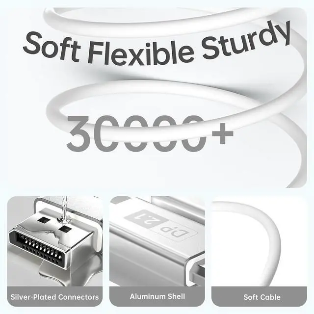 Ultra-Smooth Gaming Experience: This white soft fiber optic dp 2.1 cable upports FreeSync and G-Sync with resolutions up to 16K@60Hz 8K@120Hz 4K@240Hz and 2K@360Hz. HDR Meta Transport delivers sharper contrast and vibrant visuals. 80Gbps High