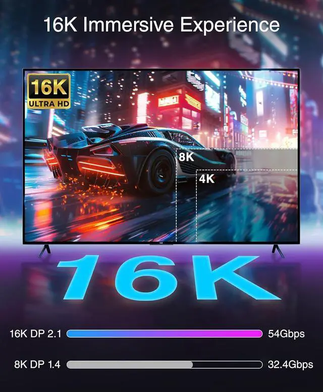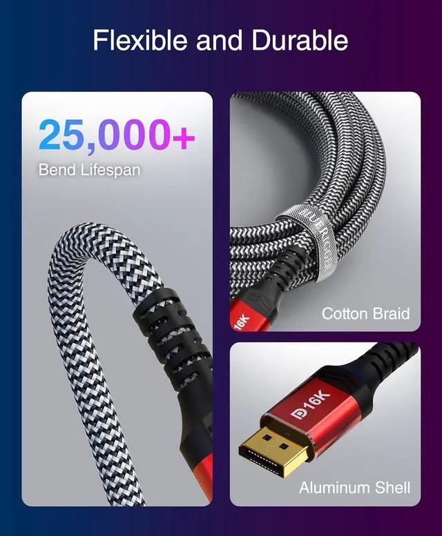 CABLE: BlueRigger 16K DP to DP cord is great for video streaming and gaming. It supports ultra-high bandwidth of 54Gbps HDCP 2.3 3D HDR10+ DSC 1.2 b & resolution up to 16K 30Hz 8K 120Hz and 4K 240Hz. Backwards compatible with DisplayPort 1.4 / 1.3 / 1.2. The computer monitor cable supports uncompressed digital audio channels at 7.1 5.1 and 2.0?