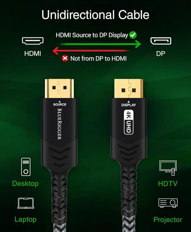 SUPERIOR BUILD: BlueRigger HDMI source to displayport monitor cable is constructed with an aluminum alloy shell and multi-layer shielding to ensure optimal signal transmission and minimize EMI/RFI interference. The 24K gold plated connectors and cotton braid increase corrosion resistance and durability?