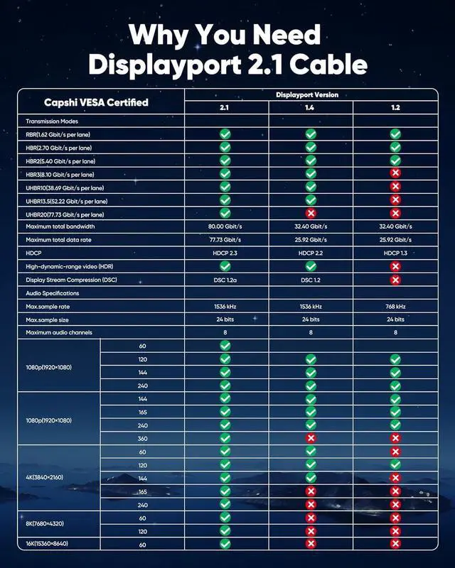 VESA Certified DP80: With 80Gbps bandwidth DisplayPort 2.1 cable supports 80Gbps stunning resolutions up to uncompressed 4K@240Hz (3840 x 2160) 8K@60Hz enabling 16K@60Hz 8K@240Hz and 4K@480Hz with DSC. Delivers crystal-clear visuals and flawless audio for gaming streaming and creative workflowsWide