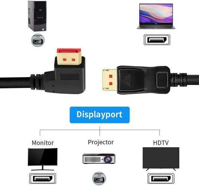 Angle Design: Access Hard-to-Reach DP Ports. The 90-degree connector design allows for a more convenient and space-saving connection especially in tight spaces or behind desks where traditional straight connectors may be difficult to useDisplayport 1.4