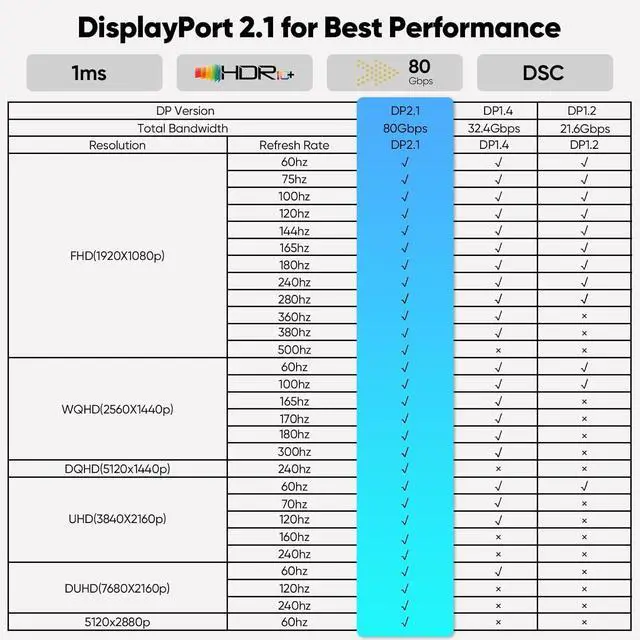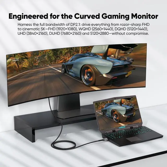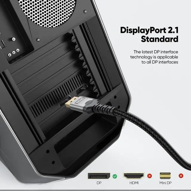 Ultra HD: DisplayPort 2.1 cables support 16K@60Hz 8K@60Hz 5K@144Hz 4K@240Hz/165Hz/144Hz and son. They are backward compatible with DP 1.4 and DP 1.2 and support HDR10 HDCP 2.2 DSC 1.2 a 32 Bit Rate for superior visual performance54Gbps