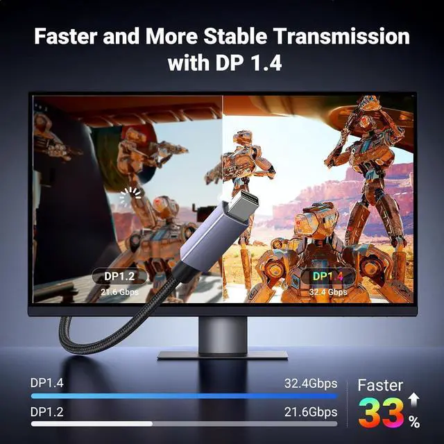 Bigger Screen: UGREEN Mini DisplayPort to DisplayPort 1.4 Cable connects laptops with Mini DP or Thunderbolt 2/1 to external DP devices. So that you can enjoy large-screen image and video on your monitors televisions or projector screens. Through this you can handle different applications at the same time to boost your efficiency. The Mini DP to DP cable is officially certified by VESA as better assurance for your using8K Ultra Resolution Designed for