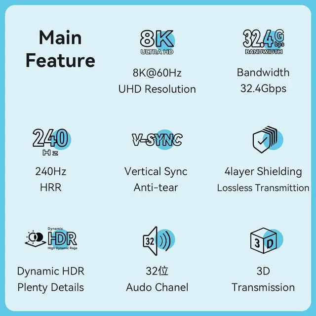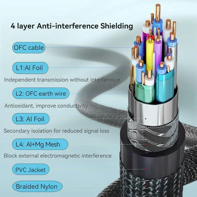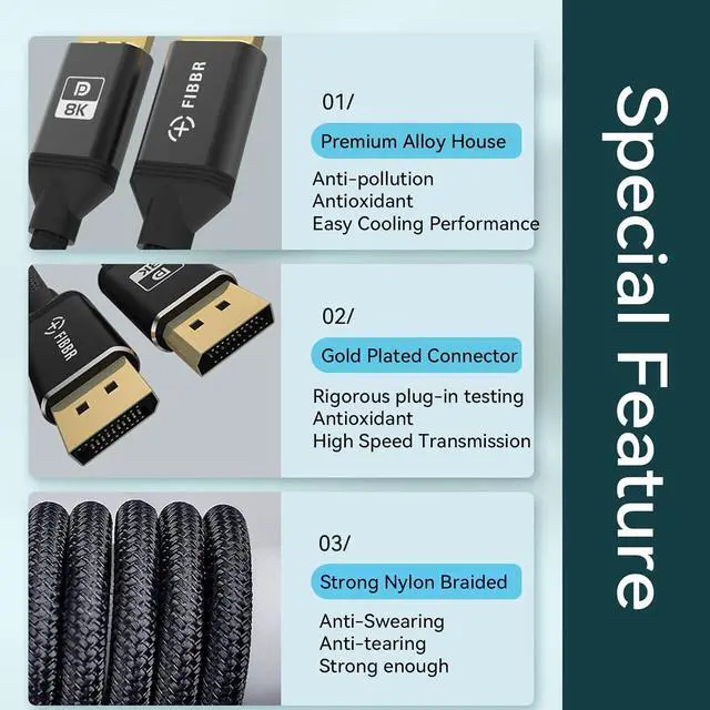 32.4G bps Displayport 1.4 CableDisplayPort 1.4 cable is VESA certified compatible with VESA DP 1.2 DP 1.1 standard. DP 1.4 Cable support transmission speed up to 32.4G bps bandwidth stable and high-speed transmission without loss of signal. Flicker-Free Gaming Experience8K DisplayPort 1.4 cable supports FreeSync and G Sync technology perfect for the latest massive FPS games and Ultra HD video streaming. Support 8K@60Hz 4K@165Hz/144Hz 2K@240Hz. Single-screen video output dual-screen 8K@60Hz 4K@144Hz three-screen display 4K@60Hz. Super Anti-Interference CapabilityThe DP 1.4 cable is made of 28AWG pure copper core triple shielding and PVC braided jacket. The graphene shield is ultra-resistant to EMI.