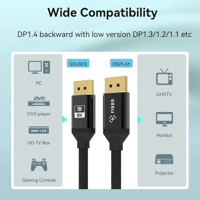 Ensure stable signal transmission of Displayport 1.4 Cable without worrying about artifacts and audio/video synchronization issues. Thoughtful DesignThe premium DisplayPort 1.4 cable adopts non-locking design and integrated 24K gold-plated connector design avoiding damage to your equipment when unplugging the monitor and graphics card. DP connection ports made of metal and PC speed up heat dissipation and extend cable life. Wide CompatibilityBidirectional DisplayPort to DisplayPort cable is suitable for graphics cards monitors projectors with Displayport ports backward compatible with DP 1.3 DP 1.2 DP 1.1 DP 1.0 Version. Compatible with FreeSync G-Sync Odyssey G7 G9 CHG90 CRG9 Ben Q HP iiyama Alienware monitors and more.