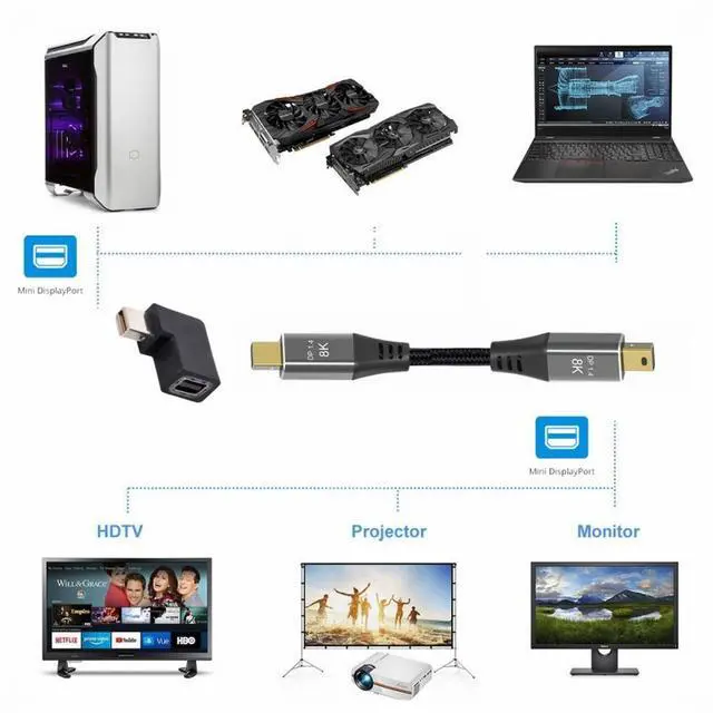 MiniDisplayPort male to female adapter, support 8K high resolution 7680 * 4320