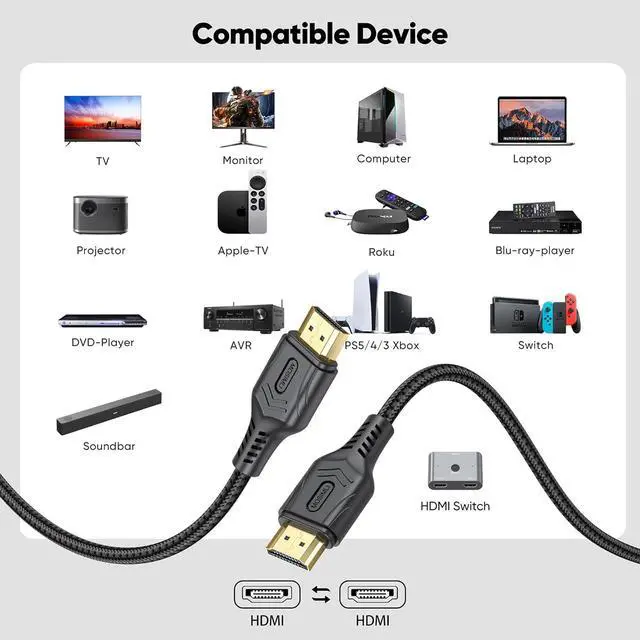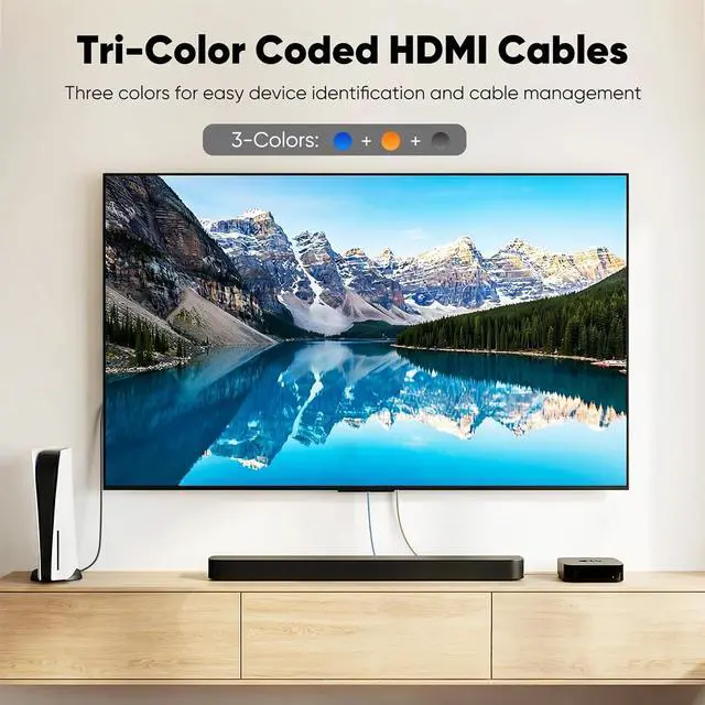 Cable 6FT Versatile: Your All-in-One Connector! Three colors(Black/Blue/Orange) make it easy to identify connected devices making this an ideal solution for home theaters gaming setups and office workstations. Easily connect your TV to an entertainment center mid-range projector monitor or gaming console-to-TV setup delivering reliable high-definition picture quality for everyday use18Gbps Ultra-HD BandwidthThe High Speed HDMI 2.0 Cable Supports 4K@60Hz / 2K@240Hz with backward compatibility for HDMI 1.4 / 1.3 / 1.2 standardsTotal Audio ImmersionEnjoy cinematic immersion with full HDMI 2.0 support including (HDCP 2.2 ) (HDR10) (ARC) Audio Return Channel ( 5.1CH ) Dolby TrueHD SBTM DTS-HD Master Audio 3D CEC 8-10-12bit Plug & PlayUniversal CompatibilityThe HDMI 2.0 Cable Works seamlessly with TV PS5/PS4 Pro/PS4/PS3 Xbox Series X/S/One X Switch Mac/Windows PCs /-TV / Fire TV Monitor Laptop Soundbar NVIDIA / AMD GPUs Blu-ray players / DVD playersConvenient Support PlanWe provide 18 months of dependable customer care. For assistance please use the instant messaging system and we will respond promptly