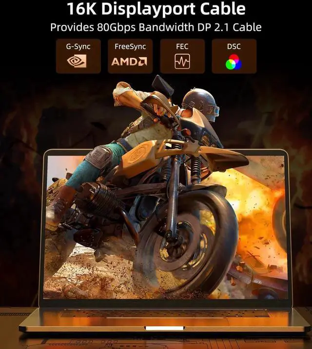 DisplayPort Cable 2.1:16K DisplayPort Cable 2.1 cable provides higher bandwidth, Supports 80Gbps High Bandwidth, Dynamic HDR, HDCP 2.2, DSC1.2a. High refresh rate and high resolution maximize the performance of your graphics card and monitor. Supports DP, DP++, and DisplayPort++. NOT compatible with HDMI / Mini DP.