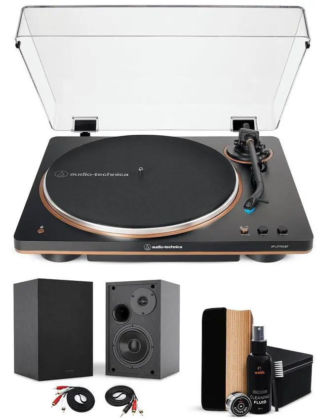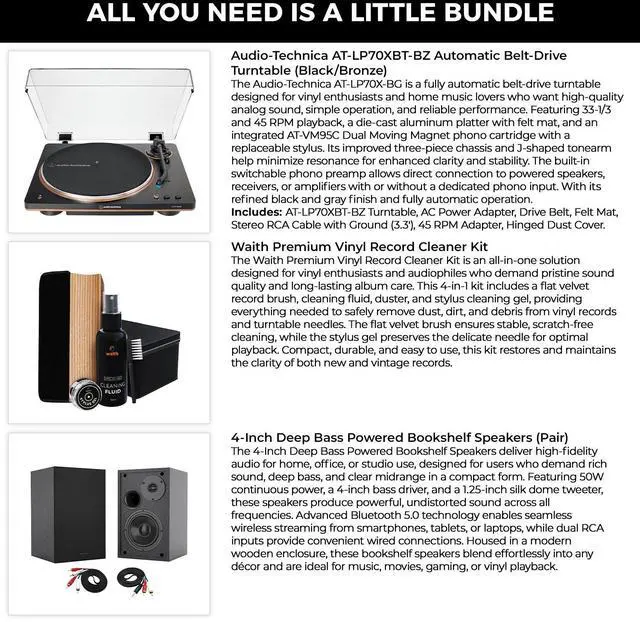 This essential bundle completes your vinyl setup with 4-Inch Deep Bass Powered Bookshelf Speakers (Pair), delivering 50W of continuous power, rich low-end response, and clear mids and highs. With Bluetooth 5.0 and dual RCA inputs, the speakers offer versatile wireless or wired listening options. The included Premium Vinyl Record Cleaner Kit helps protect your collection, featuring a velvet brush, cleaning fluid, duster, and stylus gel to keep records and needles clean for consistently optimal sound quality.