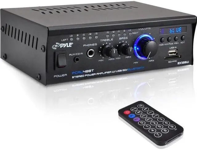 The Pyle Mini Blue Series (PCAU48BT) mini stereo power amplifier provides up to 120 watts x 2 at 4 Ohms. Built-in Bluetooth technology allows you to instantly stream wireless audio from your favorite devices -- quickly and easily. This power amplifier also features USB flash and SD memory card readers with digital LCD display. Connect external devices using the RCA (L/R) or AUX ( 3.5 mm) stereo input connector jacks let the music play. It's compatible with virtually any audio or computerized device (works with iPhones Androids Smartphones iPods MP3 Players iPads Tablets etc. ).