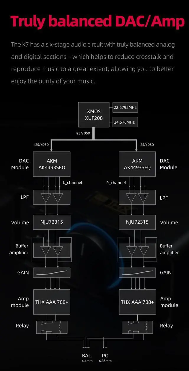 The K7 has a six-stage audio circuit with truly balanced analog and digital sections, which helps to reduce crosstalk and reproduce music faithfully and noiselessly.