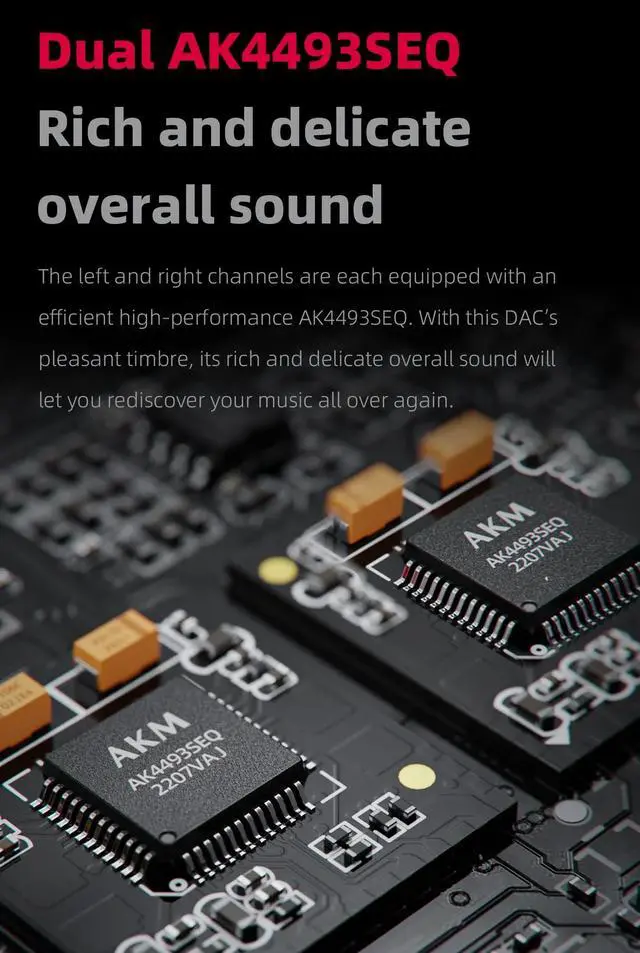 The left and right channels are each equipped with an efficient high-performance AK4493SEQ D/A chip. These 32-bit D/A chips support 768kHz PCM and DSD512, ideal for high-resolution audio source playback.