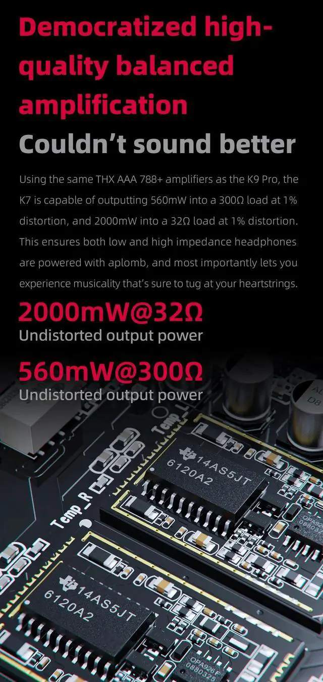 Using the same THX AAA 788+ amplifiers as the K9 Pro, the K7 is capable of outputting 560mW into a 300? load at 1% distortion, and 200mW into a 32? load at 1% distortion. This ensures both low and high impedance headphones are fully powered with optimal musicality.