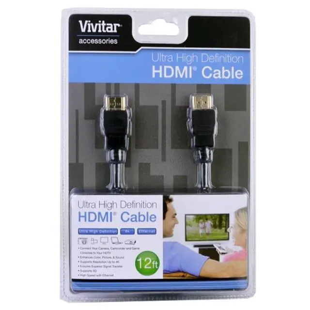 The High-Speed HDMI to HDMI Cable with Ethernet from Vivitar is a high performance cable ideal for HDTV DVD/Blu-ray players and cable and satellite boxes This premium cable supports ultra-fast speeds 3D content and ultra-high resolution of 4K It includes HDMI Ethernet Channel technology that consolidates video audio and data streams into a single HDMI cable combining the unmatched signal quality and convenience of HDMI connectivity with the power and flexibility of home entertainment networking Features Color Black Twelve foot cable Ensures speed and accuracy Supports multiple audio formats Provides complete immunity to environmental Emi and Rfi Delivers sharp detail and natural color Supports 3-D Resolutions up 4K Supports more color spaces High speed with Ethernet Package Includes 12 Vivitar VIV-HDMI-12-R Ultra High Definition HDMI Cable