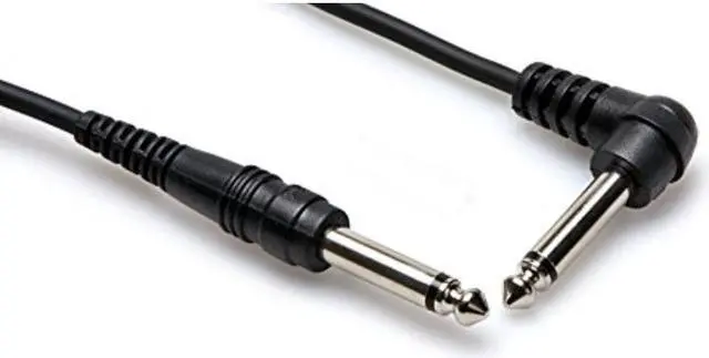 Audio cable, 1/4 inches TS male-1/4 inches TS male right angle, 10 feet long. This product manufactured by Hosa.