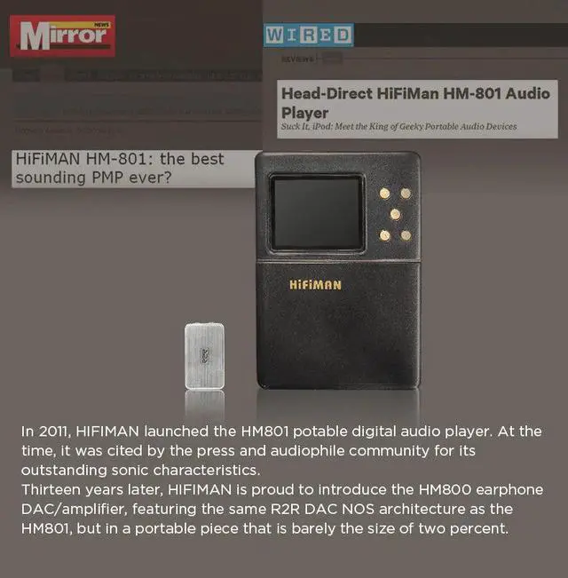 In 2011, HIFIMAN launched the HM801 portable digital audio player. At the time, it was cited by the press and audiophile community for its outstanding sonic characteristics.