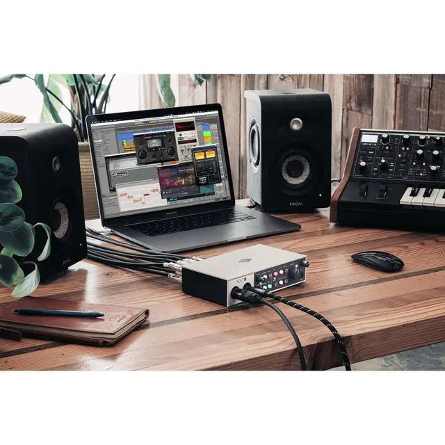 The Volt 4 also offers simple 4-in/4-out audio connections. Just plug your mics and guitars into the front panel preamps, and use the line inputs for synths and drum machines. Then connect your speakers or headphones to monitor your audio with no latency. Whether you're traveling light or setting up a home studio, the Volt 4 is ready to capture your inspiration with professional sound. It comes with a curated suite of audio software, including Ableton, Melodyne, UJAM's Virtual Drummer, Marshall, Ampeg, and more, allowing you to start creating right away.