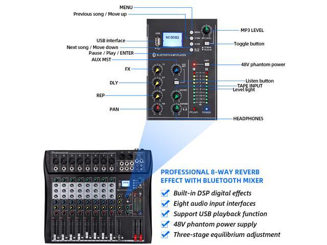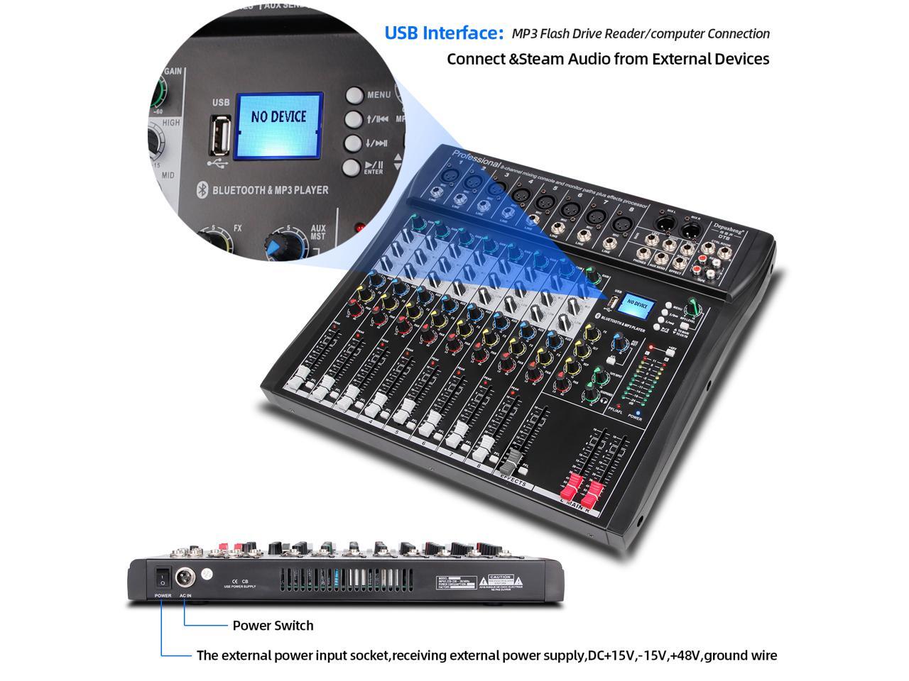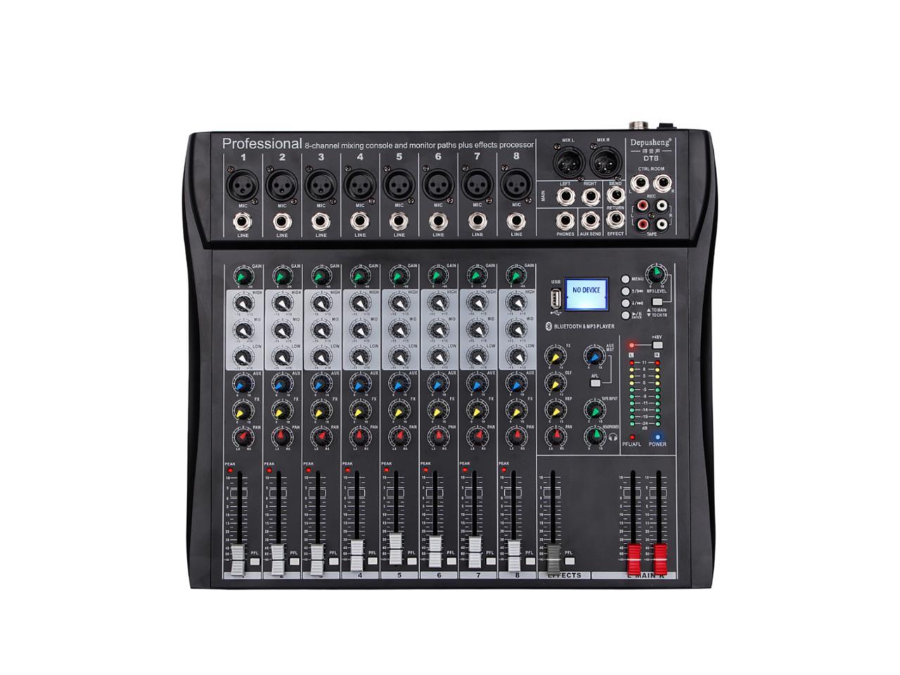 Depusheng DT8 Professional auido mixer 8 channel dj sound mixer console with Bluetooth MP3 input XRL Microphone Jack 48V phantom power supply and USB drive for Computer Recording black