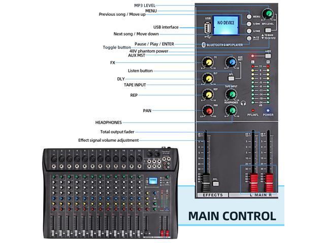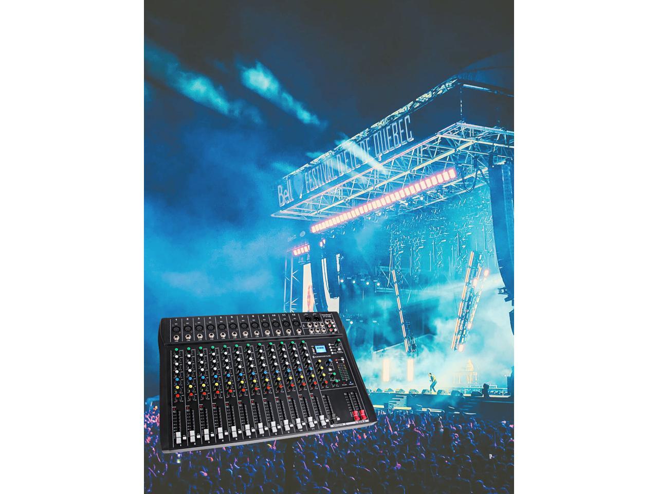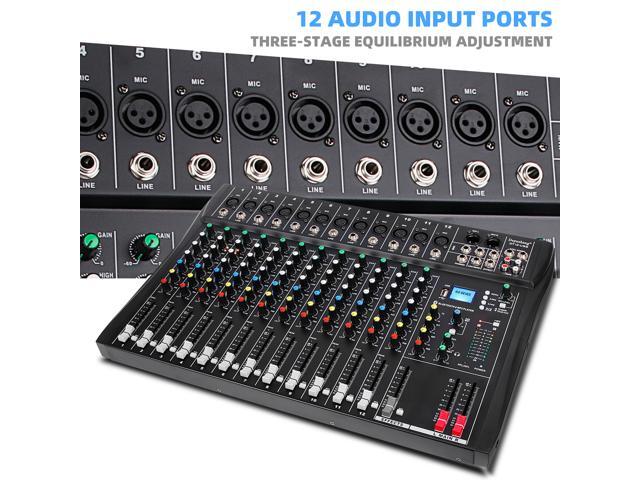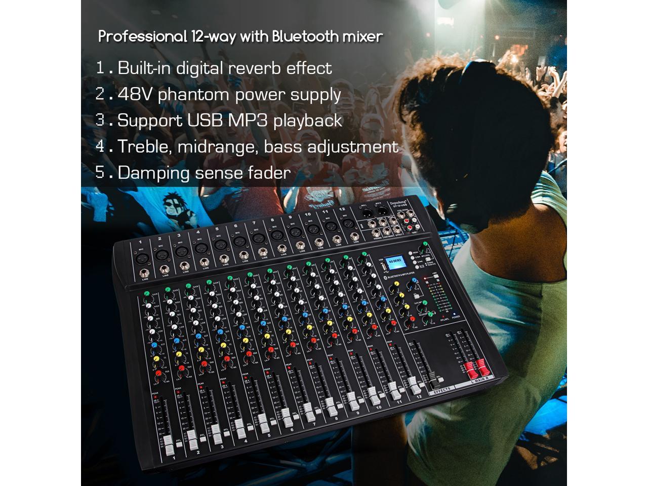 Depusheng DT12 Professional Audio Mixer 12 Channel DJ Interface mixer console with Bluetooth MP3 input XLR Microphone Jack 48V Power RCA Input Output and USB Drive for Computer Recording black