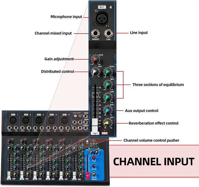 The 7-channel audio mixer can accommodate multiple devices. Suitable for small performances/bands/conferences/home use/Anchor K song/computer recording, etc.