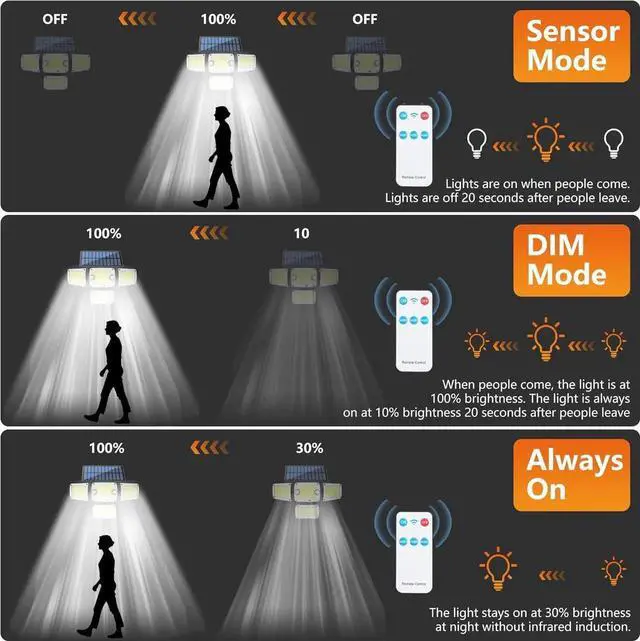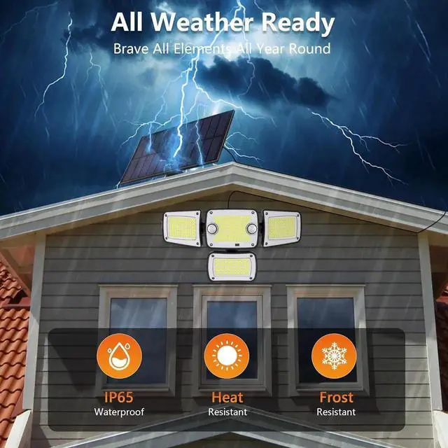 All-Weather Waterproof Design: With an IP65 waterproof rating, this 4-head solar motion light is built to withstand various outdoor weather conditions. Ideal for gardens, pathways, streets, and other outdoor spaces, it provides reliable illumination regardless of the weather.