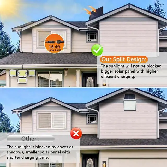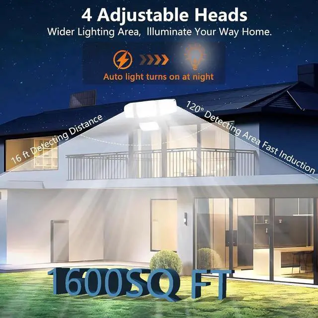Adjustable Lighting Angles: With a total power of 15W and 3000 lumens of brightness, this outdoor motion sensor lamp provides clear, bright illumination. The four adjustable light heads allow flexible lighting angles, ensuring optimal coverage to meet diverse lighting needs.