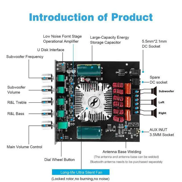 Powerful sound field experience: integrated TDA7498E power amplifier chip, supports 2.1 channel configuration, including left channel, right channel and subwoofer output. The left and right channels provide an output power of 160W each, and the subwoofer reaches a maximum output of 220W, creating an immersive audio experience for you.
