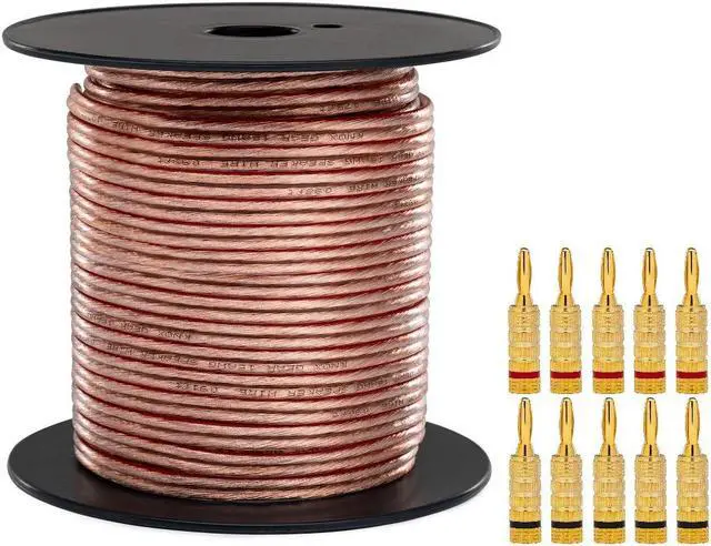 Upgrade your home entertainment sound system with Knox Gear speaker wire and banana plugs. Our 100-feet speaker wire features a high strand count and 16 AWG CCA conductors for maximum conductivity. It delivers the same corrosion resistance and signal frequency as a copper wire at a lower cost. Featuring a flexible insulated exterior jacket, our home audio speaker wire can be easily routed through speaker stands and home theater cabinets for superior sonic performance. The wire is wrapped on a hard spool to prevent wire damage due to entanglement. You can easily pair it with our closed screw banana plugs for high-quality undistorted signals from your speaker to an A/V receiver or amplifier. Our gold-plated banana plugs can be used with 12 to 18 AWG wires for high-fidelity sound. Compatible with both bare wire and spades, these brass banana plugs offer secure contact with traditional binding posts. Our banana connectors are color-coded with red and black rings to distinguish left from right for matching polarity. Backed by Knox Gear 1-year limited warranty. The Knox Gear 16AWG Speaker Wire (100') and Gold Plated Speaker Banana Plugs (5 Pairs) Kit combines two complementary parts to connecting your sound system or home theater system.