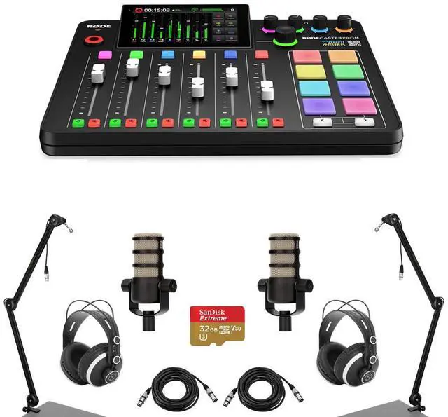 Become a master of audio production with the advanced RODECaster Pro II Integrated Audio Production Studio Console Bundle. This comprehensive package is designed for professional streamers, podcasters, musicians, and content creators who demand superior sound quality and innovative features. The RODECaster Pro II is more than just an audio console; it's a complete audio production solution. It combines all the elements typically found in a professional podcasting, streaming, or studio setup into one powerful, user-friendly console. With this bundle, you get two PodMic microphones, two TAPH500 headphones, two broadcast arms, two M to F XLR cables, and a 32GB microSD card, providing a complete solution for recording and producing high-quality audio content.