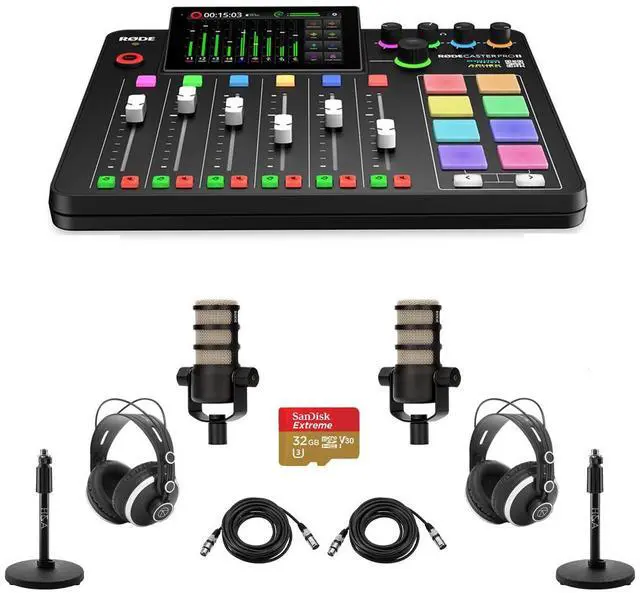 Explore the limitless potential of the RODECaster Pro II Integrated Audio Production Studio Console Bundle, a comprehensive and advanced solution for audio content creators, podcasters, musicians, and streamers. This professional-grade bundle is packed with high-quality equipment, including two PodMic microphones, two TAPH500 headphones, two mic stands, two M to F XLR cables, and a 32GB microSD card, offering a versatile and all-inclusive solution for your audio production needs. The RODECaster Pro II is designed with user-friendly features, boasting an intuitive interface that simplifies the audio production process.