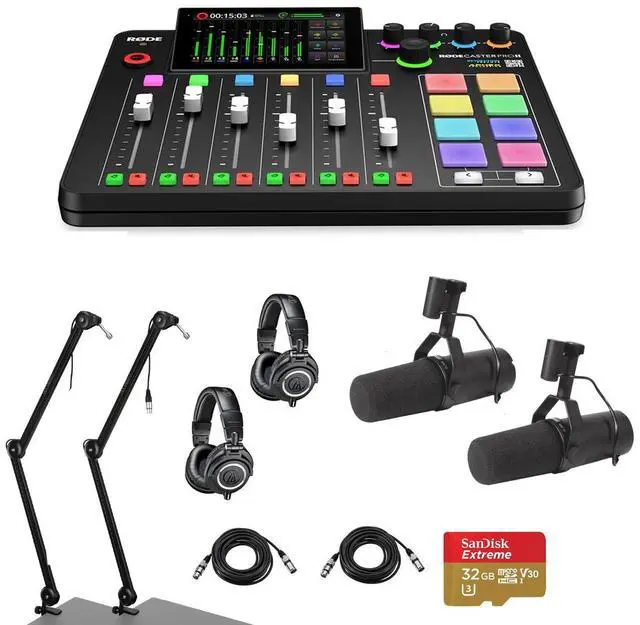 Just when you thought audio production couldn't get any more streamlined, the RODECaster Pro II Integrated Audio Production Studio Console Bundle emerges as the quintessential tool for streamers, podcasters, musicians, and content creators seeking an advanced, professional-grade recording experience. This comprehensive package not only includes the innovative RODECaster Pro II console but also pairs it with industry-leading SM7B microphones, ATH-M50x headphones, broadcast arms, XLR cables, and a 32GB microSD card to ensure you have everything you need for high-quality audio production. The RODECaster Pro II is engineered to simplify the complex audio production process, integrating all the elements of a professional setup into one high-quality, easy-to-use console.