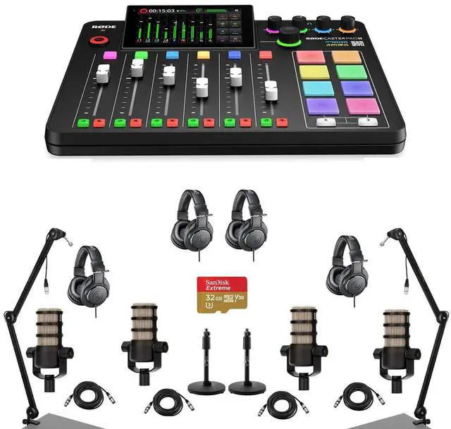 The RODECaster Pro II is also MFi-certified for seamless integration with iOS devices and offers tailored presets for RODE microphones. The RODECaster Pro II is designed to evolve, with a commitment to ongoing firmware updates that will introduce new features and enhancements. These updates can be easily downloaded and installed via Wi-Fi, Ethernet, or USB, ensuring that the console remains at the cutting edge of audio production technology. In summary, the RODECaster Pro II Integrated Audio Production Studio Console Bundle is the most feature-packed audio production solution available, offering unparalleled sound quality, ease of use, and customization for creators who demand the best in their audio recordings.