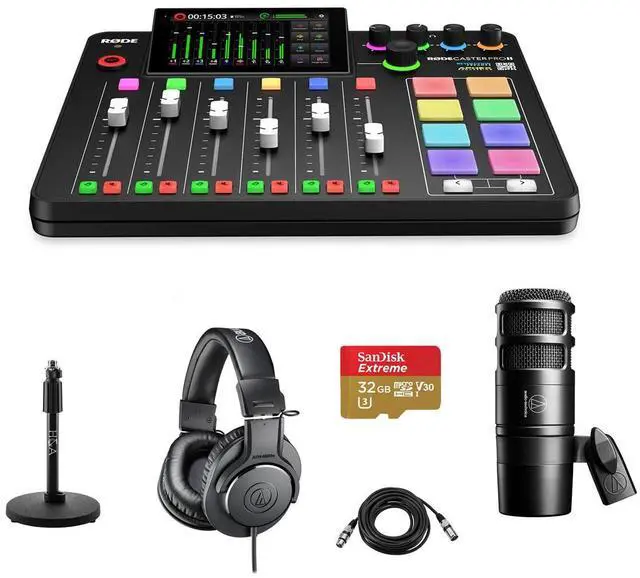 When it comes to professional audio production, the RODECaster Pro II Integrated Audio Production Studio Console Bundle stands out as an advanced, all-in-one solution for podcasters, musicians, streamers, and content creators. This innovative bundle includes the high-quality Audio-Technica AT2040 microphone, ATH-M20x headphones, a sturdy mic stand, M to F XLR cable, and a 32GB microSD card, providing a comprehensive package for all your recording needs. The RODECaster Pro II console is designed for superior sound quality and unmatched ease of use. Its large 5.5 -inch high-definition, full-color touchscreen with haptic feedback, tactile rotary encoder, bright RGB color-coding, and hands-on controls simplify navigation, making it easy for any creator to set up and record high-quality content in seconds.