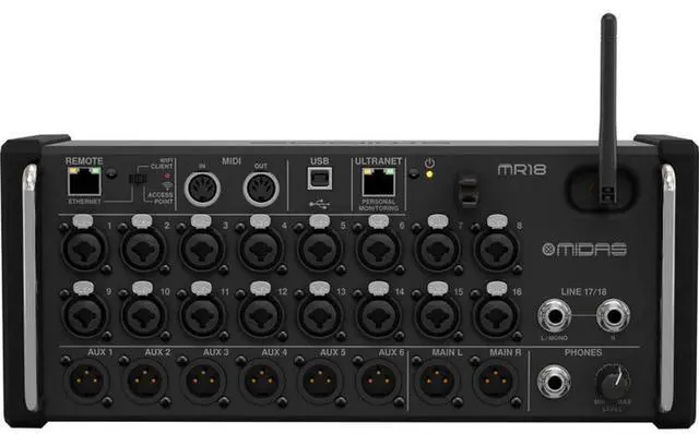 MR18 18-Input Digital Mixer for iPad/Android Tablets with 16 MIDAS PRO Preamps, Integrated Wi-Fi Module and Multi-Channel USB Audio Interface. iPad/Android tablet controlled 18-input digital mixer for studio and live application 16 award-winning MIDAS PRO microphone preamplifiers Built-In Tri-Mode Wi-Fi router for direct operation-no need for external routers 18 x 18 channel, bidirectional USB 2.0 interface Dugan-style Auto-Mixing automatically manages microphone gain sharing 4 digital signal processing effects engines ULTRANET connectivity for P-16 Personal Monitoring System Rack ears and protection bumpers included for flexible rack and onstage applications 6 aux and main LR buses with inserts, full dynamics processing and 6-band parametric or 31-band graphic EQ 6 XLR aux outputs and 2 XLR main outputs plus phones connector 40 bit floating point digital signal processing Free iOS, Android and PC/Mac/Linux apps available for remote operation via Ethernet, LAN or Wi-Fi MIDI In/Out allows controlling the mixer via MIDI equipment or for use as a USB MIDI interface Future firmware updates, incl.
