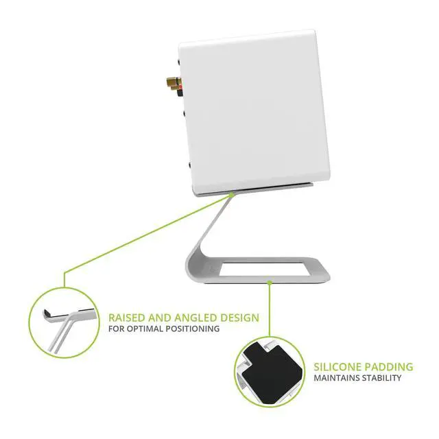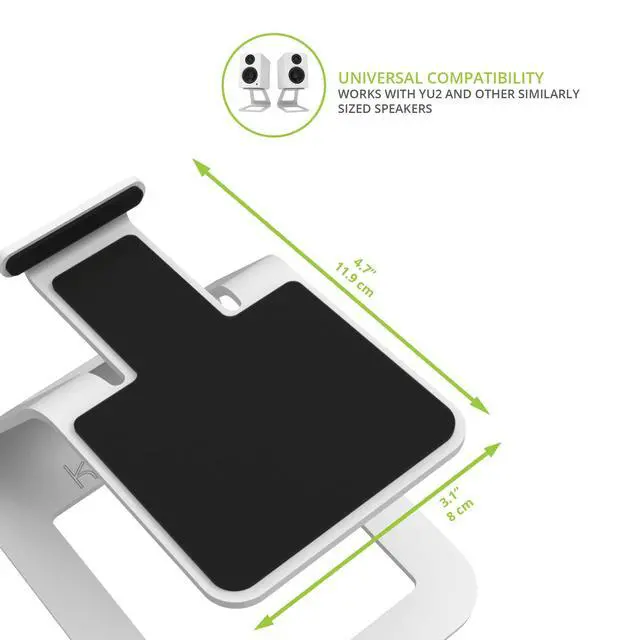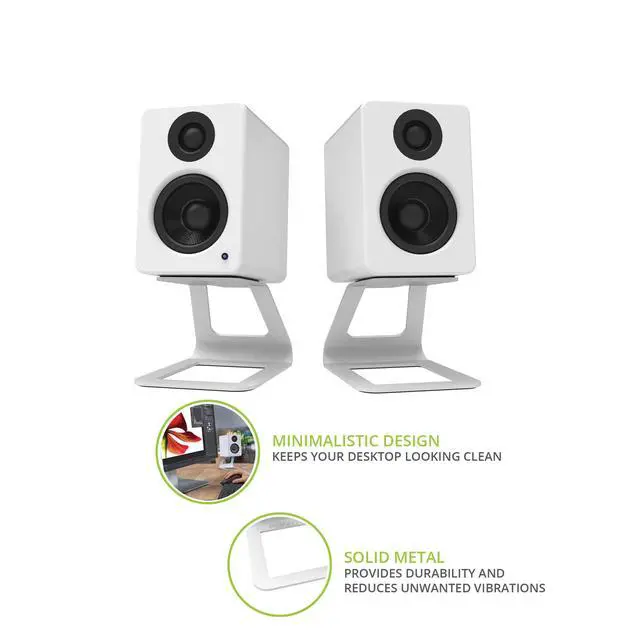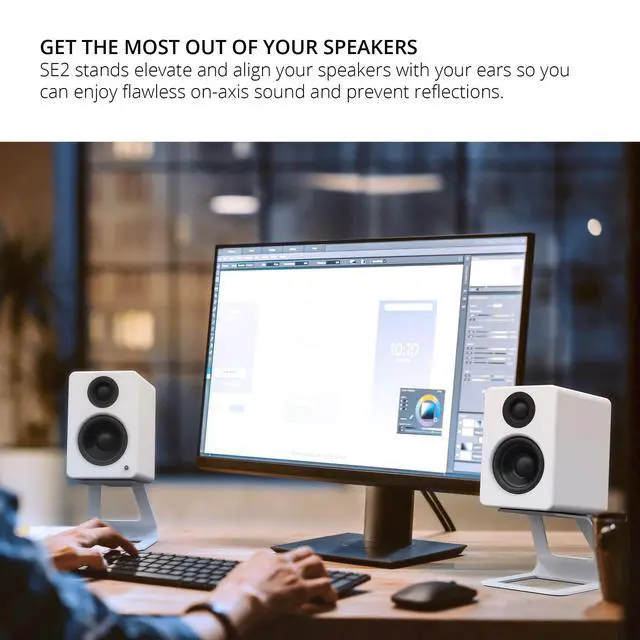 Free up desk space and enjoy superior sound quality with the SE2 Elevated Speaker Stand. With a height of 3.8", the SE2 boosts your speakers up and off the surface of your desk so that they're better aligned with your ears to give you a flawless on-axis response. Its cantilevered and angled platform is designed to absorb resonance and deliver a pure sound without any reflections from nearby surfaces. 1.5mm of silicone padding provide a strong grip that helps keep your speakers and stand in-place. The SE2 comes with a black or white finish and can hold up to 7.1 lbs.