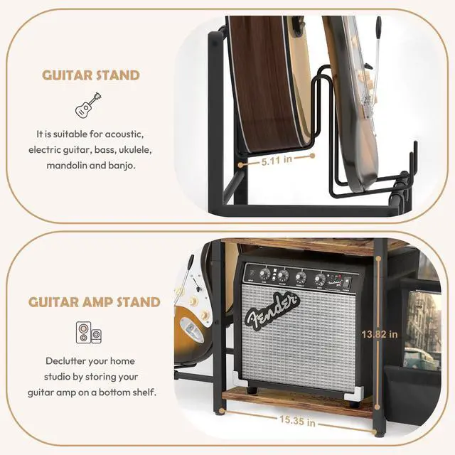 Guitar stand: The distance between the holder arms of the guitar rack is adjustable, so that the guitar stand floor is suitable for placing electric guitar, acoustic, bass, ukulele, etc. The guitar stand multiple guitars with 3-tier storage shelf provides enough space for you to store your amplifier, guitar accessories and guitar books.