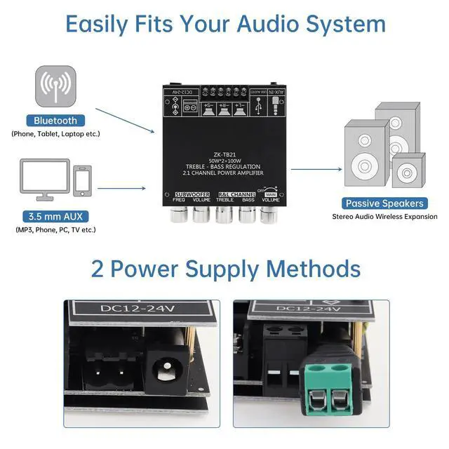 - It is recommended to use a power supply of 12-24V, 5A or more, and the speaker power is 50-100W for the best effect!
