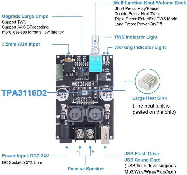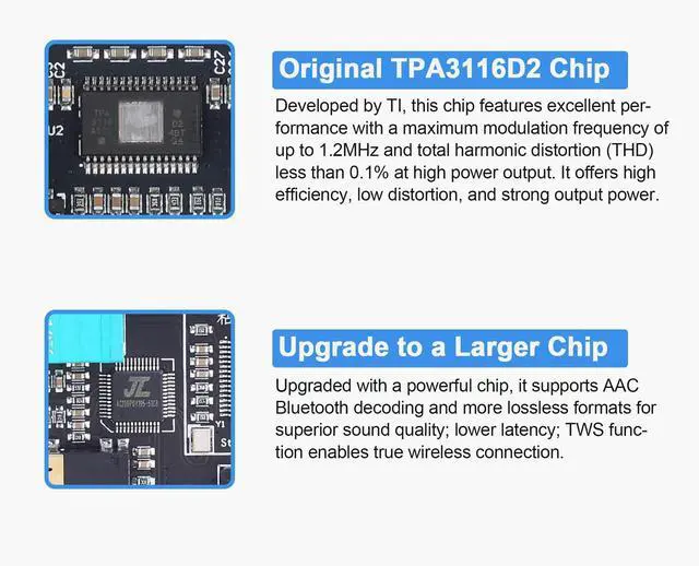 The ZK-1001B amplifier board supports multiple audio input options, including Bluetooth 5, 3.5mm AUX wired input, USB sound card, and USB flash drive, allowing easy connection to most mainstream audio sources. You can freely choose your preferred input mode based on the scenario or personal preference—no drivers required, simple and convenient.