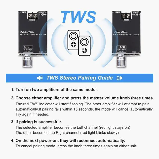 4.The next time the units are powered on, they will automatically reconnect. To cancel the pairing, simply press the knob on either amplifier three times.