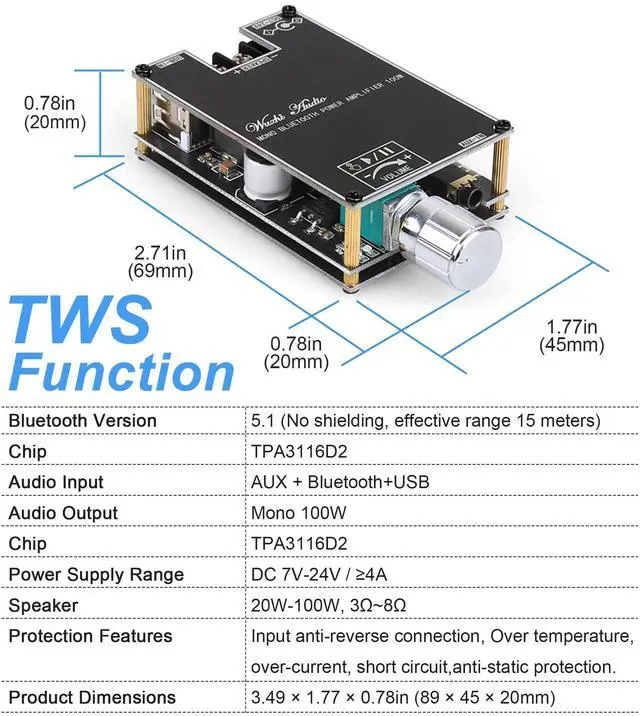 The ZK-1001B mono Bluetooth power amplifier board adopts TPA3116D2 chip, with a peak power output of up to 100W. It has multiple input methods such as Bluetooth, AUX, USB drive, USB sound card input, etc. It supports APP and box to box functions, making it easy to use and easy to connect.