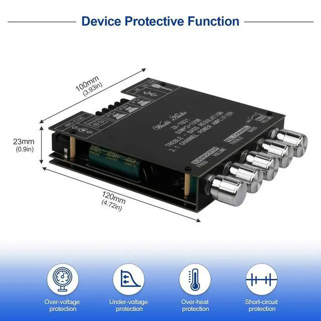 - Audio amplifier board with over-voltage protection, under-voltage protection, over-heat protection, short-circuit protection.