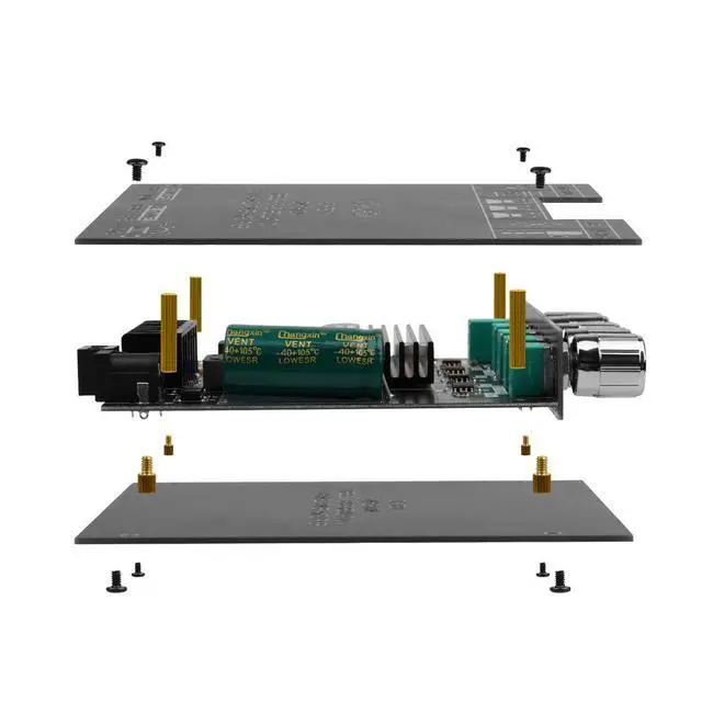 1 x Audio amplifier module with 3 buttons 2 x Shell 3 x Button 4 x Gold Nut 4 x Gold Screw 8 x Black Screw 1 x Screwdriver