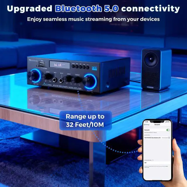 Bluetooth range up to 32FT/10M.Please switch to bluetooth mode first and the bluetooth control distance is at an accessible distance.