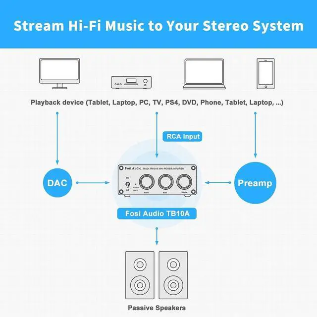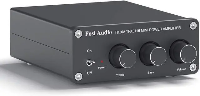 Ultra-compact and high power output in a small aluminum enclosure. MAX Power Output up to 100W X 2(4 ohms, 20 Hz - 20 kHz, 0.04% THD). TB10A can drive 200watts(8 ohm), 300watts(4 ohm) passive speakers