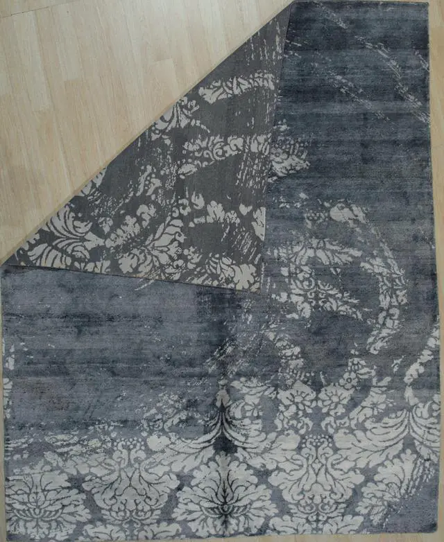 The Hand-Knotted Bamboo Silk and Wool Black Transitional Abstract Modern Indo Nepal Rug is a luxurious and artistically crafted piece that seamlessly blends modern design with the rich textures of bamboo silk and wool. Here's a description to capture its essence: